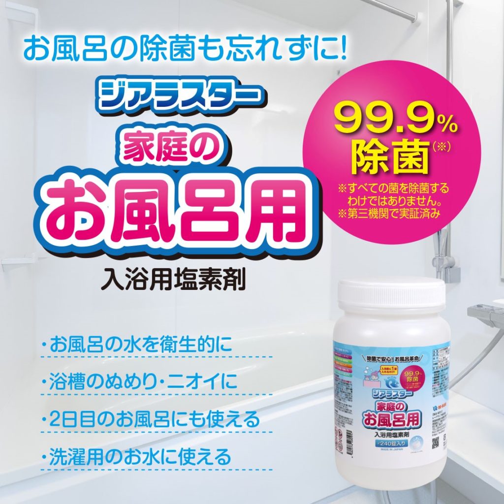 家庭のお風呂には雑菌が一杯です。水道水に含まれる塩素は0.5~1ppmです。1番風呂の方が湯に入ると大腸菌等により安全な「浴用水」では無くなります。それらを補充し、家族を守りましょう。(新型ウイルスは80℃の熱が必要です。40℃程度では危険です)