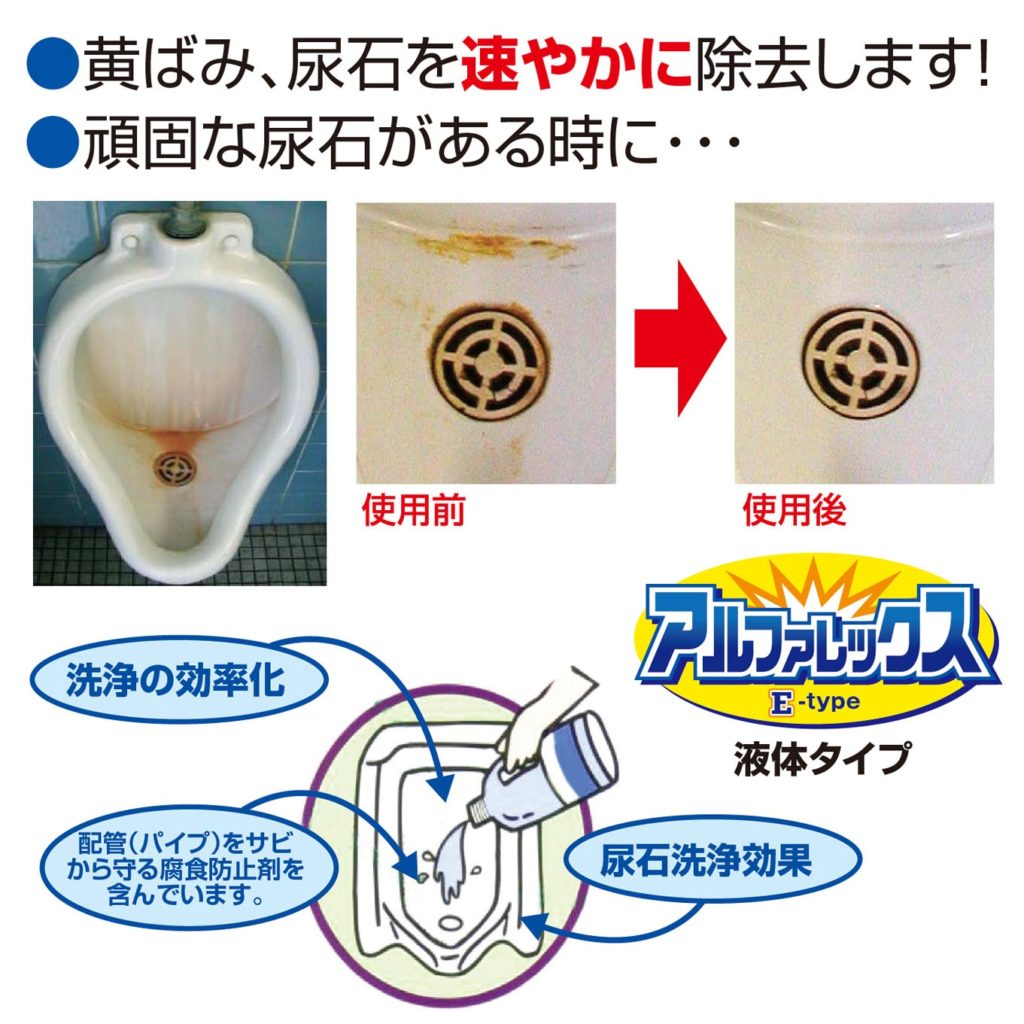 高粘度液体タイプのトイレ用尿石洗浄剤です。排水口の詰まりや悪臭も改善され、配管にやさしい金属腐食剤入りです