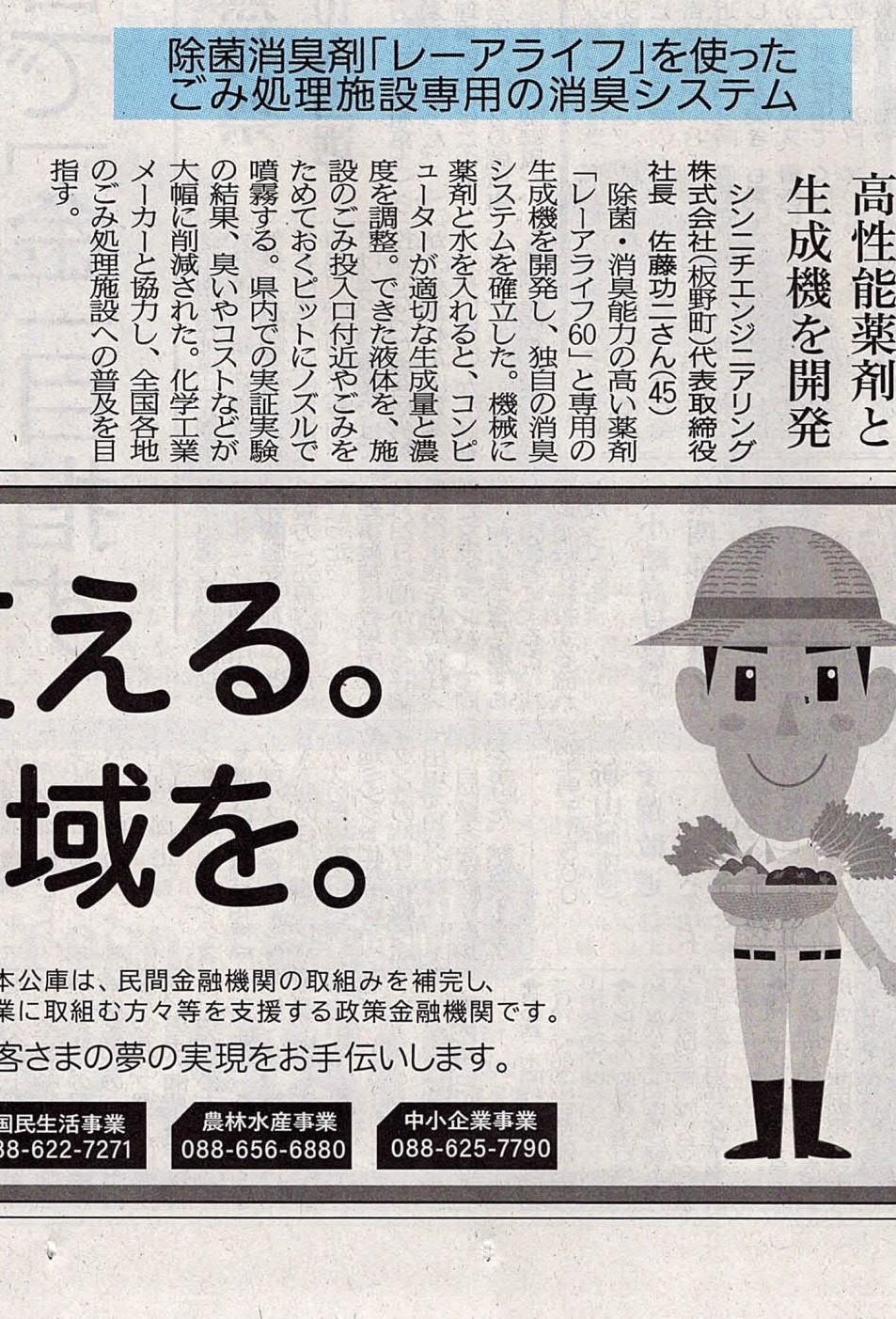 「レーアライフ」の生成器、レーアライフNPCと専用薬剤レーアライフ60が徳島新聞に掲載されました。令和2年1月31日