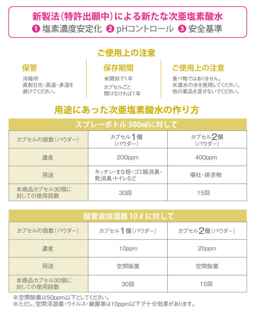 加湿器に水を入れ、パウダー1個を入れ溶かしてください。 次亜塩素酸水の空間噴霧に好適です。