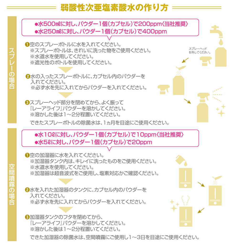 レーアライフとは次亜塩素酸ナトリウムを調整した水溶液等の混合物でありません。